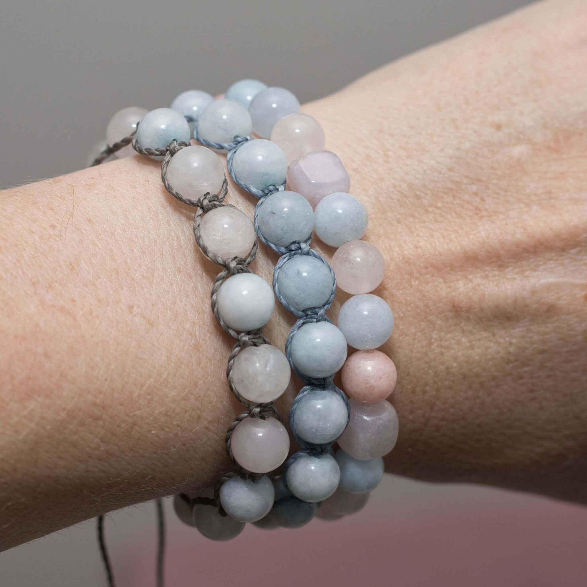 Dieses Armband wurde für alle werdenden Mütter oder Frauen entworfen, die versuchen, schwanger zu werden. Es ist aus Kristallen gefertigt, die dafür bekannt sind, eine gesunde Schwangerschaft zu fördern, und eignet sich perfekt als Geschenk für einen besonderen Menschen. Verwendet wurden Mondstein, Rosenquarz, Amethyst, Aquamarin, Lepidolith, Heliotrop und Fluorit. Die Perlen sind auf ein graues, gewachstes Kordelband aufgezogen, und das Armband ist durch einen Schiebeknoten verstellbar. Abgeschlossen wird es mit 6 mm Aquamarin- und Rosenquarz-Perlen als Stoppern sowie einer Lotusblüten-Perle als besonderem Akzent.